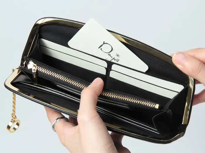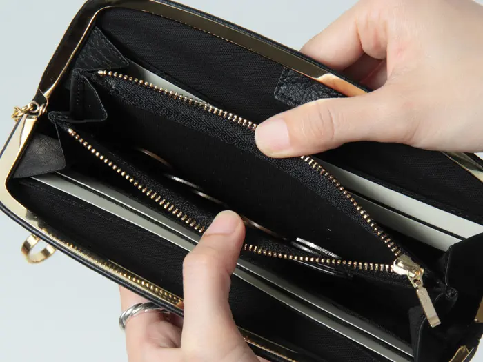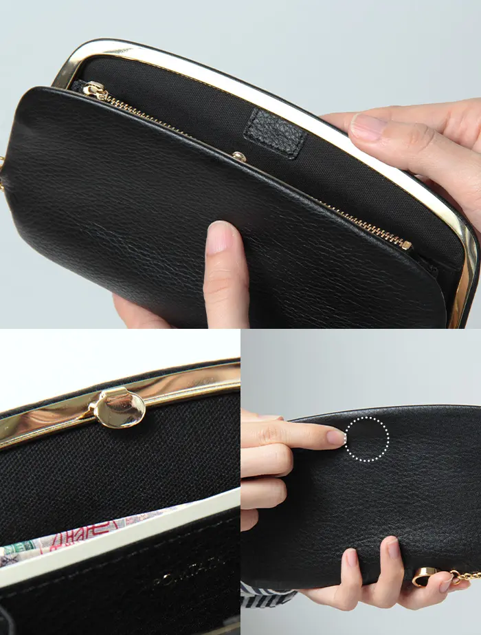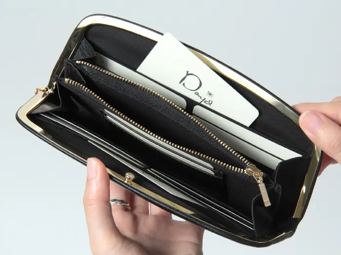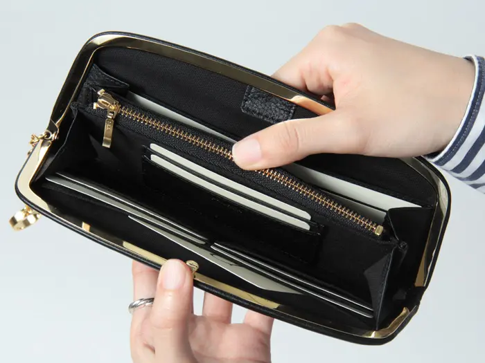 がま口を開くと中が大きく見渡せる設計で、会計時の動作もスムーズ。フリーポケットも備え、見た目以上に整理しやすい収納力を備えています。