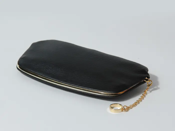 ひねり金具を使わない、個性が際立つがま口構造も魅力のひとつ。「天溝がま口」と呼ばれる仕様で、背面上部中央を指で押すことで開閉します。一般的なワンタッチ式とは異なる仕立てで、現在では対応できる職人が限られる、希少性の高いディテールです。