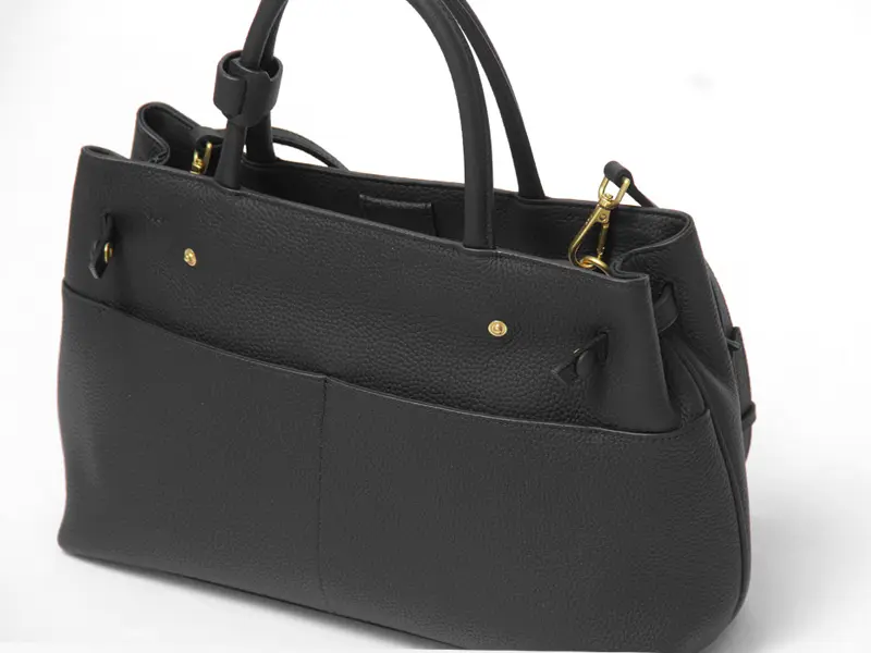 背面には、スマホやパスケースの収納に便利なオープンポケットを2箇所装備。 サイドのスナップボタンを外すことでマチがさらに広がり、厚みのある荷物もスムーズに収納できます。 使う人の動作を美しくサポートする、細やかな機能美が光る設計です。