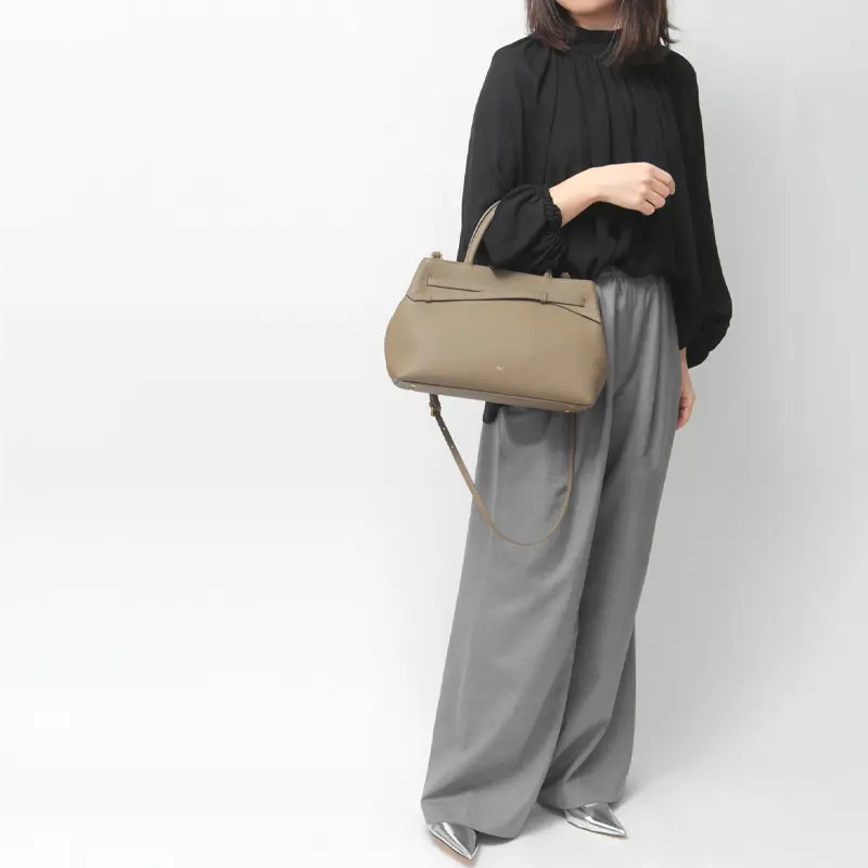 開閉口は中央のマグネット式レザータブで、片手でスマートに荷物を出し入れできます。 内側にはファスナーポケットを完備し、鍵や貴重品もすっきり整理可能。 コンパクトなルックスながら、長財布やスマホ、さらには折りたたみ傘やタンブラー、タブレットまで収まる頼れる収納力がポイントです。
