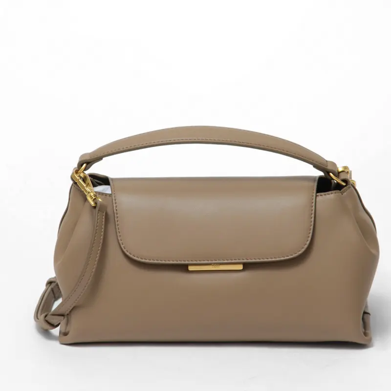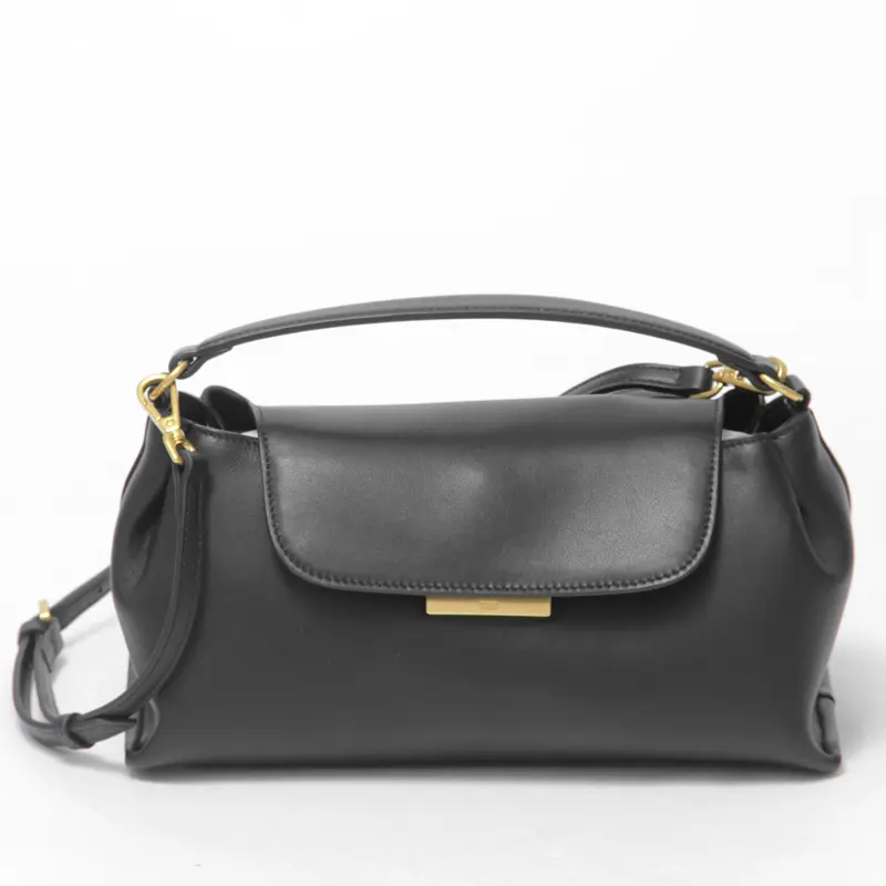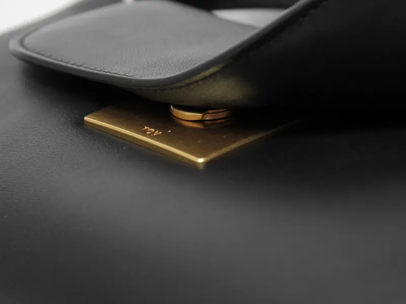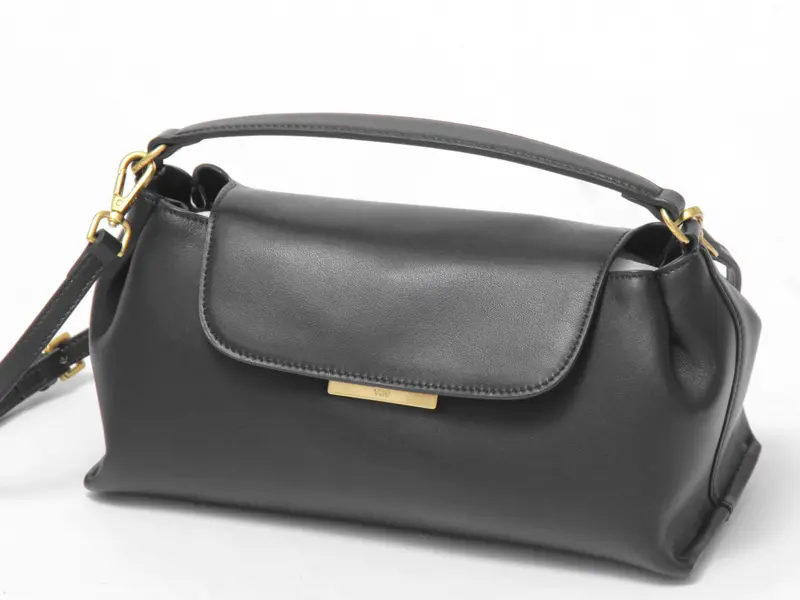 水染め特有の、柔らかでキメの細かさが特徴の牛革を使用したハンドバッグです。スフレのようにふっくらとした独特のボリューム感と柔らかな風合いで、軽量ながらも高級感のある佇まい。シャープなスクエア型のオリジナル留め具が、レザーの質感とのコントラストを生み出し、モダンな印象を与えます。背面にはさりげなく素押しのブランドロゴを施し、ディテールまでこだわった仕上がりです。
