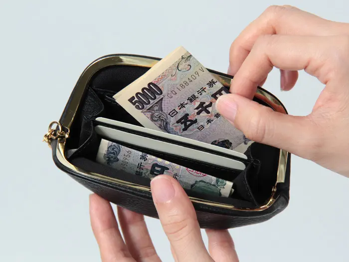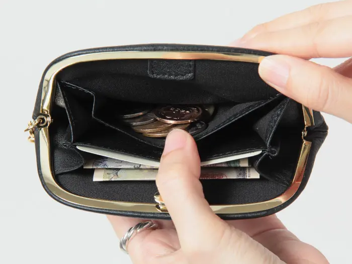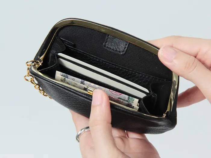 がま口を開くと中身が見渡しやすく、会計もスムーズ。コンパクトなサイズながら、お札・小銭・カードをバランスよく収納できる設計です。