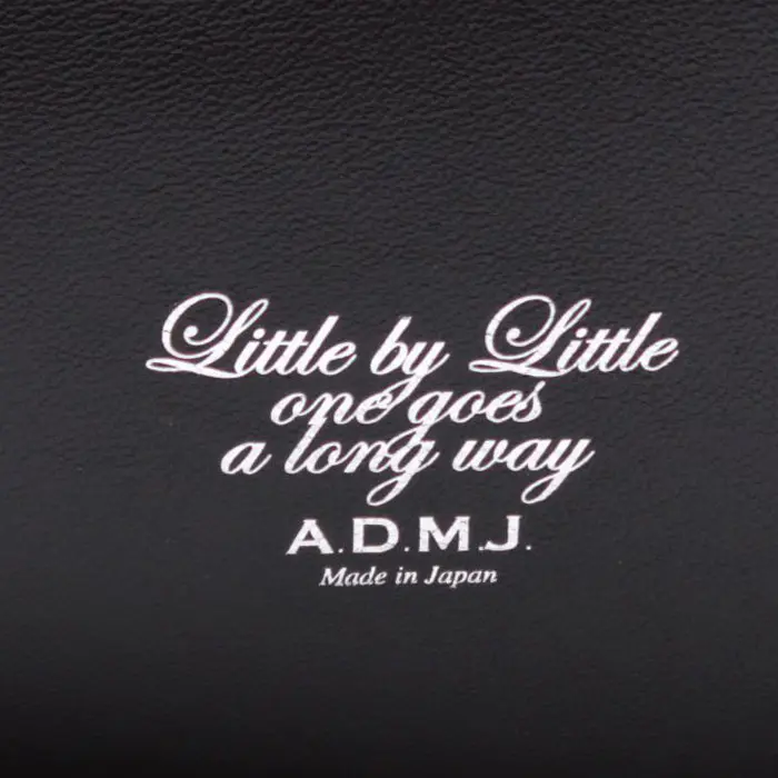箔押しであしらった「Little by Little one goes a long way(千里の道も一歩から)」の言葉には、素材やパーツ一つひとつと丁寧に向き合い、ものづくりを積み重ねてきたA.D.M.J.の想いが込められています。