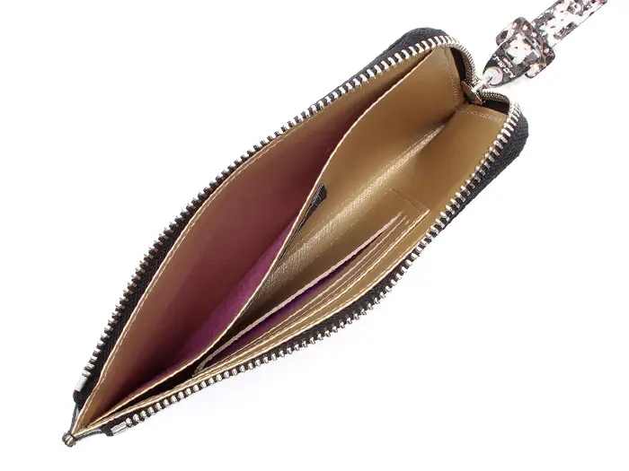 大きめのレザー引手で開閉しやすいL字ファスナー仕様。スマートフォン・現金・カード類をひとまとめにできる、実用性の高いマルチウォレットです。