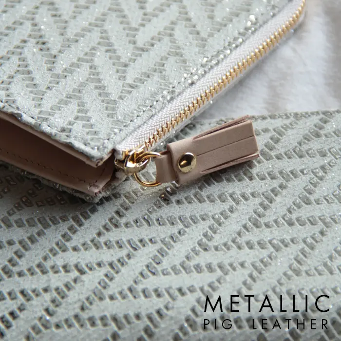箔加工を施したピッグスキンレザーを採用。 ほのかにきらめくメタリックな質感が、手元にさりげない華やかさを添えます。 豚革ならではの柔らかさを活かしながら、表情に変化を持たせた仕上がりで、素材の個性を楽しめるデザインです。