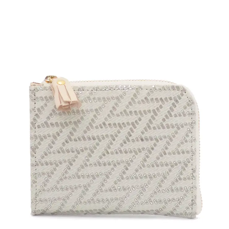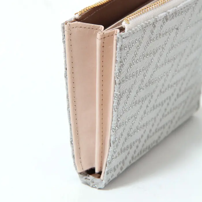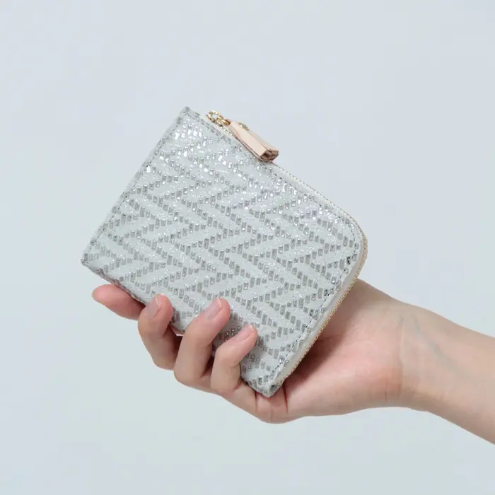 "POMTATA ポンタタ"の定番シリーズ「PAR2」から、L字ファスナー仕様のミニ財布。V字メッシュ調のメタリック型押しが、手元にさりげない華やかさをプラスします。コンパクトなサイズ感ながら必要な収納はしっかり確保でき、持ち物を軽やかにまとめたい方におすすめの一品です。