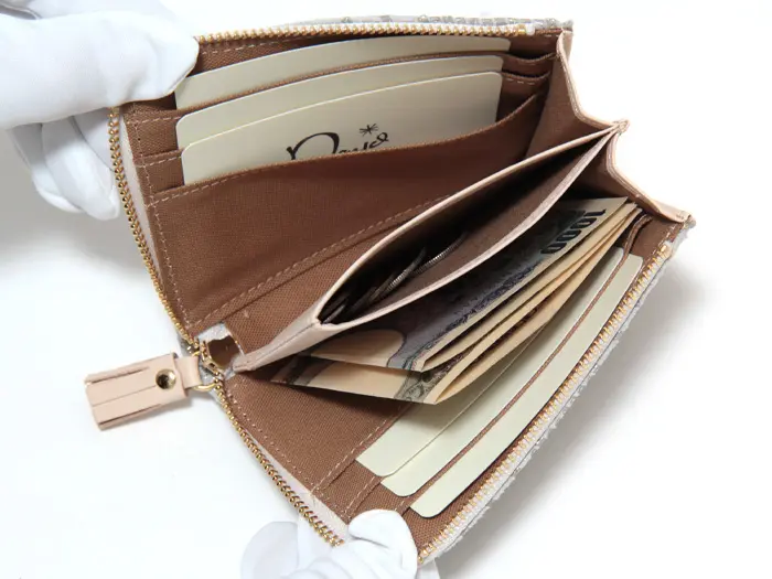 お札は二つ折りで収納可能。小銭やカードも分けて整理でき、サイドのマチが大きく開くため中身が見やすく、出し入れもスムーズです。