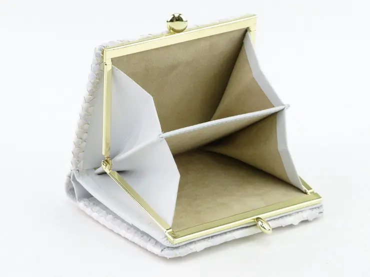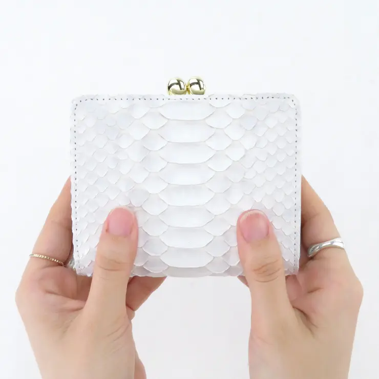 やさしいホワイトに淡くパープルの地模様が重なる「Bran Python(ブランパイソン)」シリーズ。真っ白ではなく、天然の模様をほんのり残すことで、奥行きのある美しさと女性らしいフェミニンな雰囲気に仕上げられています。上質なパイソンレザーならではの高級感に加え、金運アップが期待できる縁起の良さも魅力です。