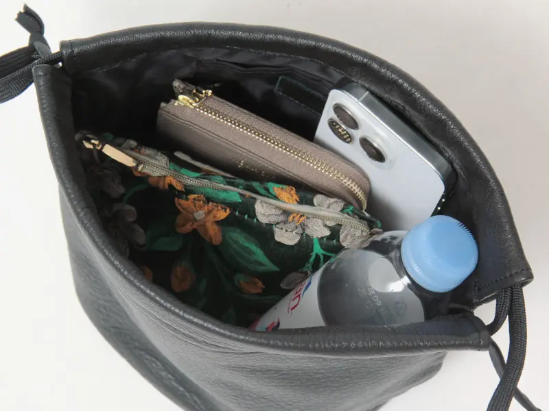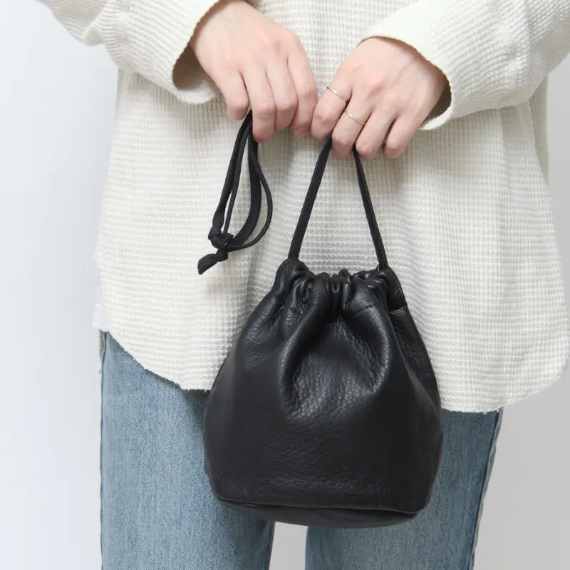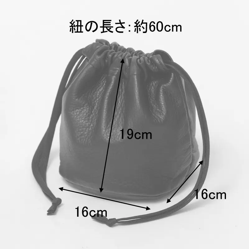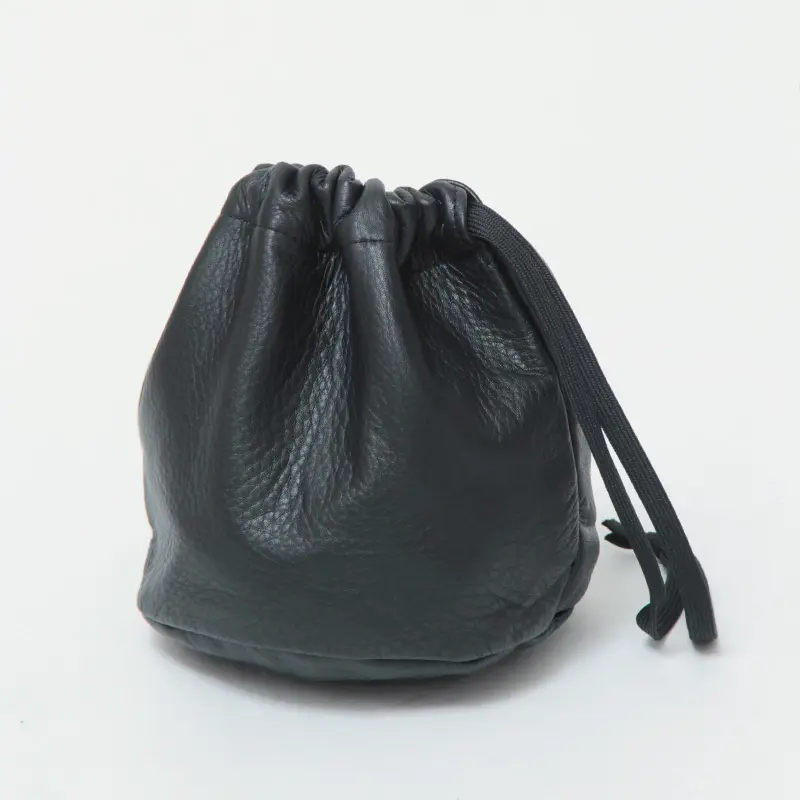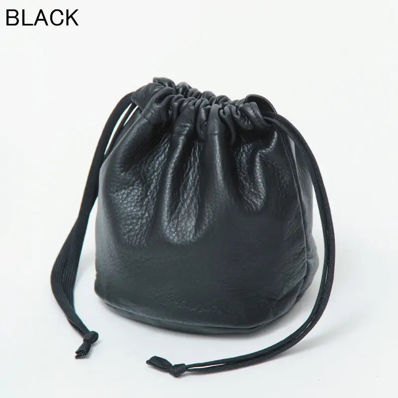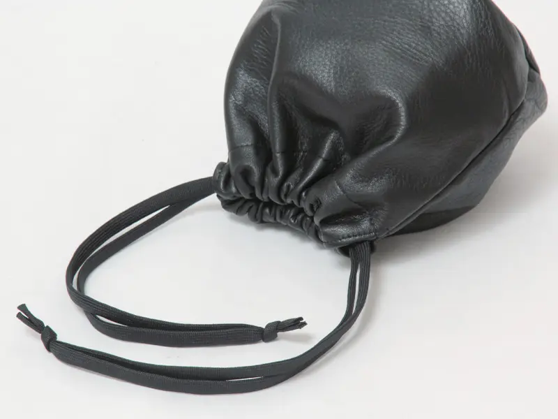 やわらかな牛革を使用し、巾着を絞った際に生まれる自然な表情も魅力のひとつ。手に取った瞬間からなじみが良く、使うほどに風合いが深まっていきます。