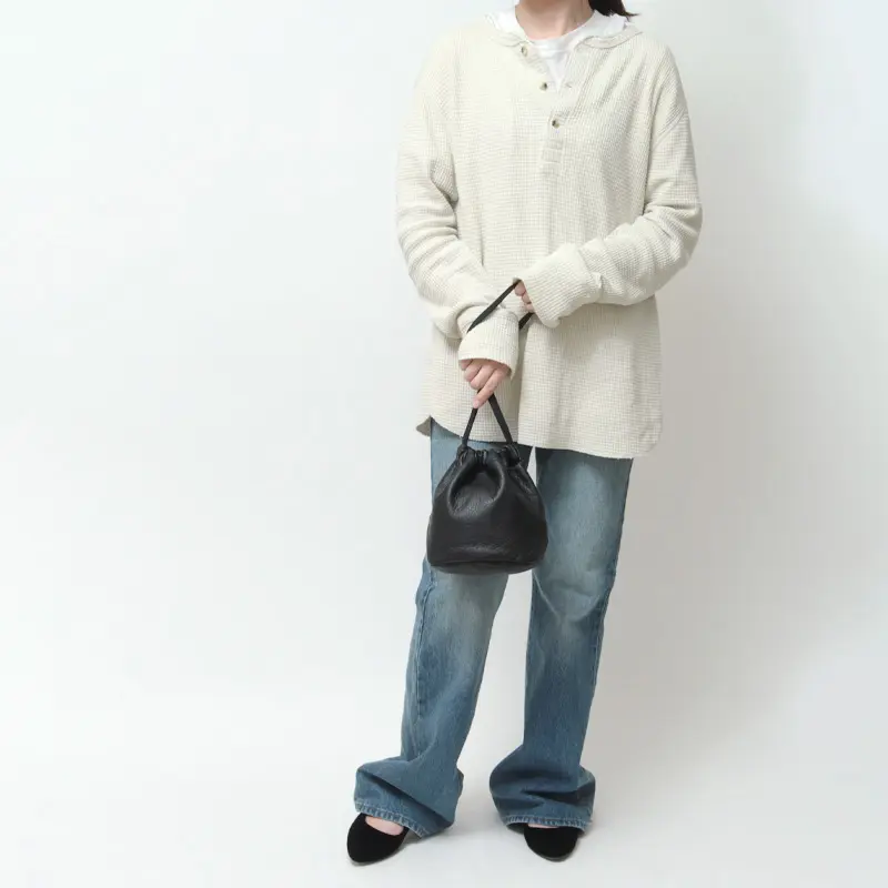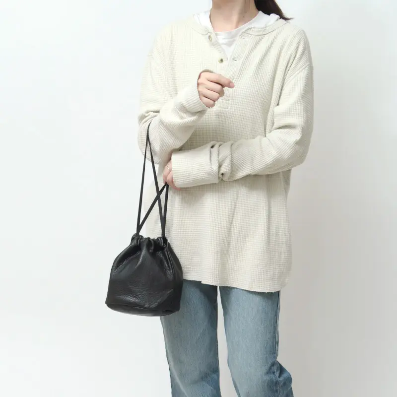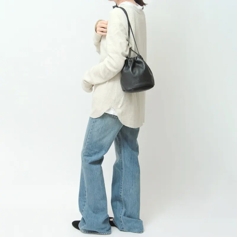 肩掛けでもハンドでもサマになる巾着ショルダーバッグ。程よい厚みと幅のストラップが手元にやさしくなじみ、快適な持ち心地を叶えます。カジュアルになりがちな巾着デザインも、レザー仕立てにすることで大人の品とこなれ感を添えてくれます。