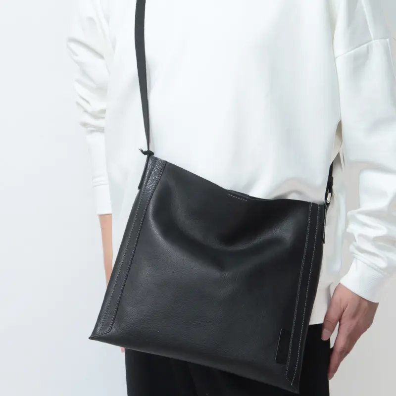 体に自然と沿うフラットなフォルムが魅力の、Daniel&Bob(ダニエルアンドボブ)のムースライトシリーズのレザーショルダーバッグ。柔らかく、ややドライな質感のシュリンクレザーを使用し一枚革で仕立てることで、軽やかさと抜け感のある表情に仕上げています。A4サイズが収まる実用的な容量を備えながら、見た目はすっきり。レザーならではの上質感が、カジュアルになりすぎない大人のリラックススタイルを演出してくれるイタリア製のバッグです。