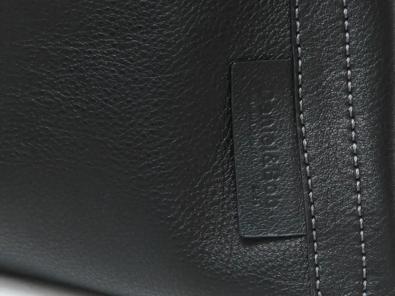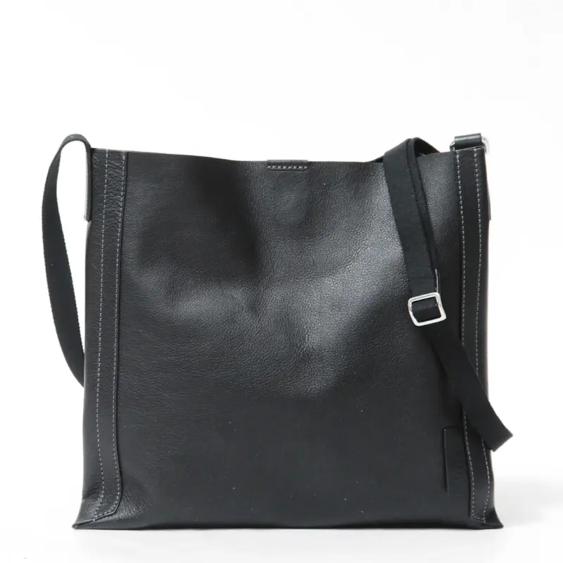 開閉はスナップボタン仕様。A4サイズのノートに加え、500mlペットボトルも収納できる実用的な容量を備えています。一枚革で仕立てることで、見た目以上に軽やかな持ち心地です。