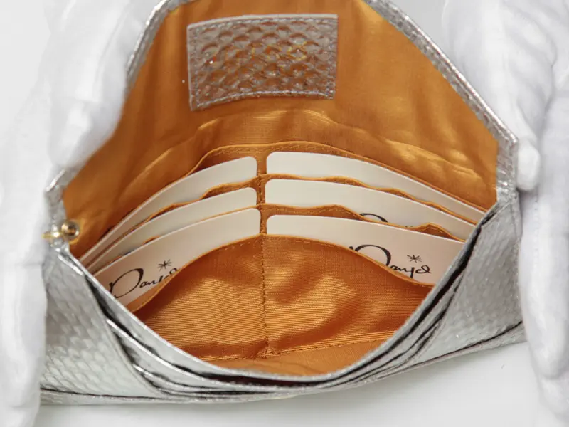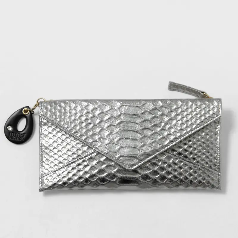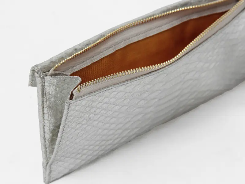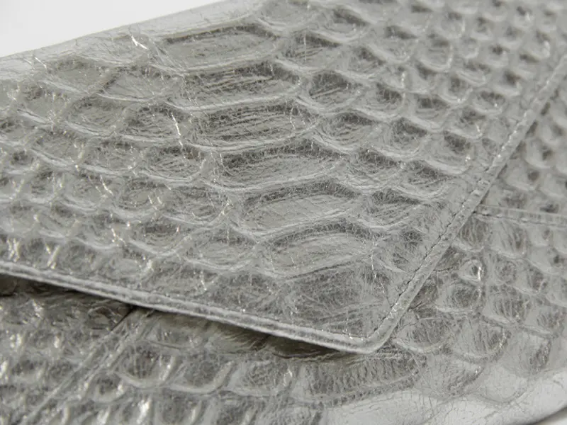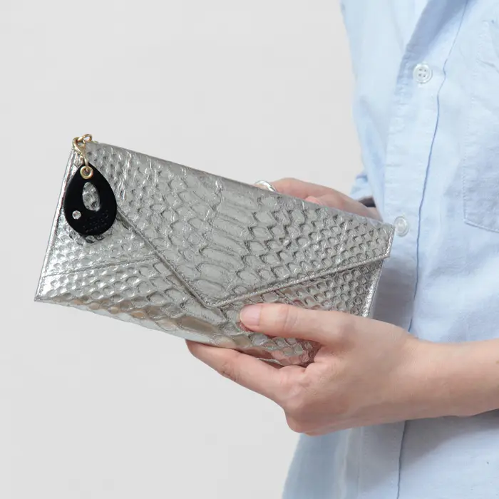 しなやかな羊革にパイソンの型押しを刻み、眩いミラー加工でドラマチックに仕上げました。 光を捉えて煌めくメタリックな質感は、まるで手元を彩るジュエリーのような華やかさ。 使い込むほどに革が柔らかく手に馴染み、タイムレスで長くご愛用いただけます。