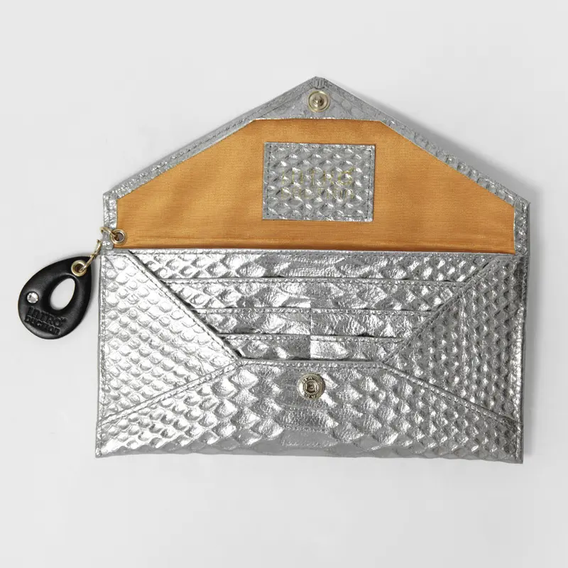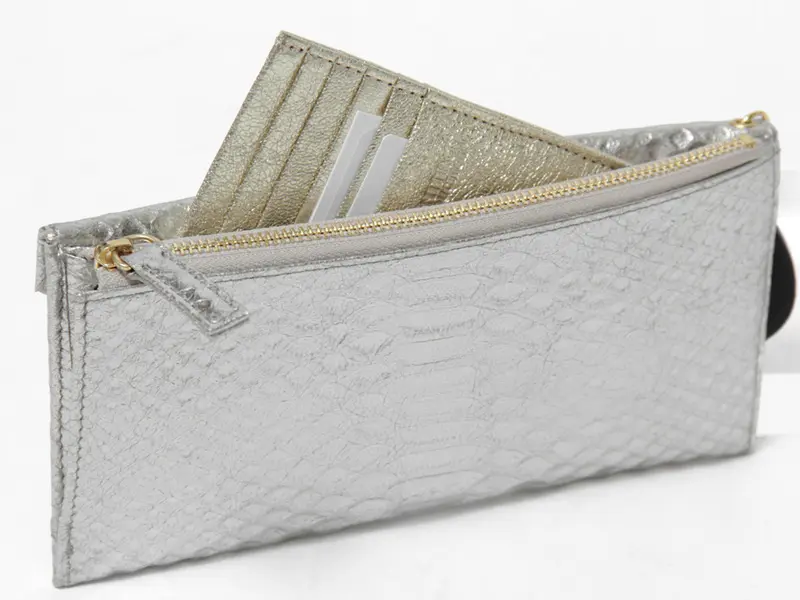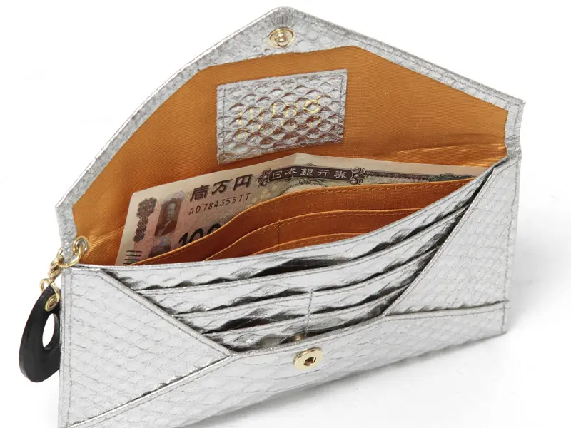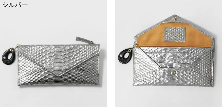 「長財布の安心感はそのままに、重さやかさばりを解消したい」 そんな声から生まれたのが、INTRODUCTION(イントロダクション)のウスマチ長財布。 エキゾチックなパイソン柄に、上品な光沢を放つシルバーカラーを乗せた「ミラーパイソン」シリーズ。 封筒のような端正なレター型デザインが、薄さを求める大人の女性にふさわしい気品を漂わせます。