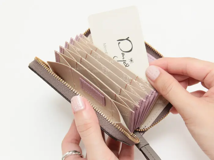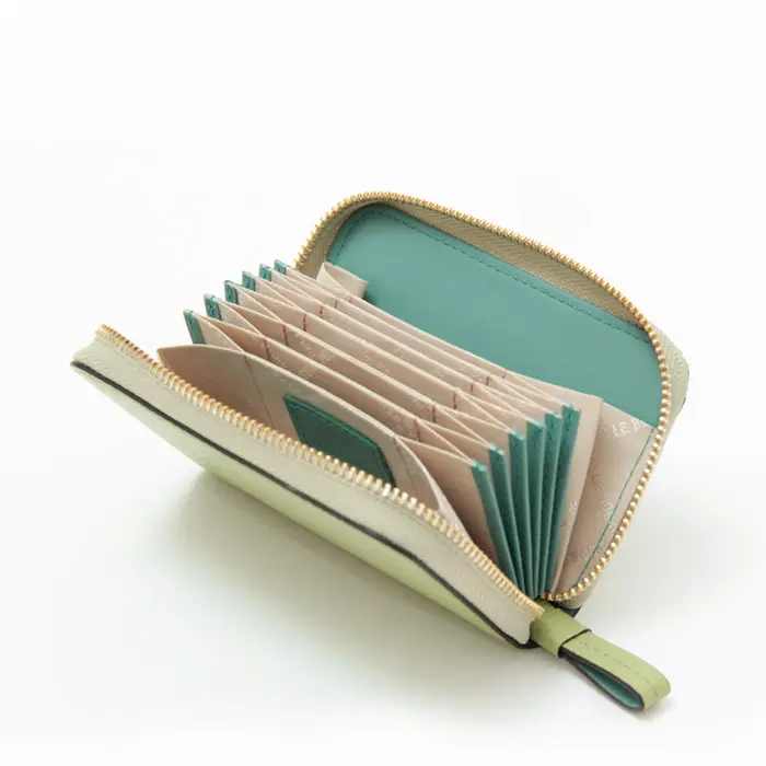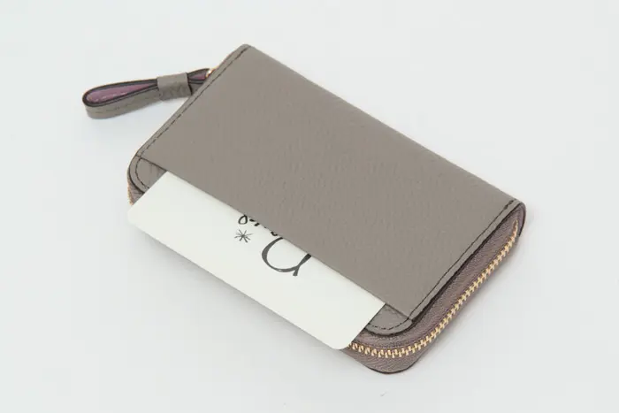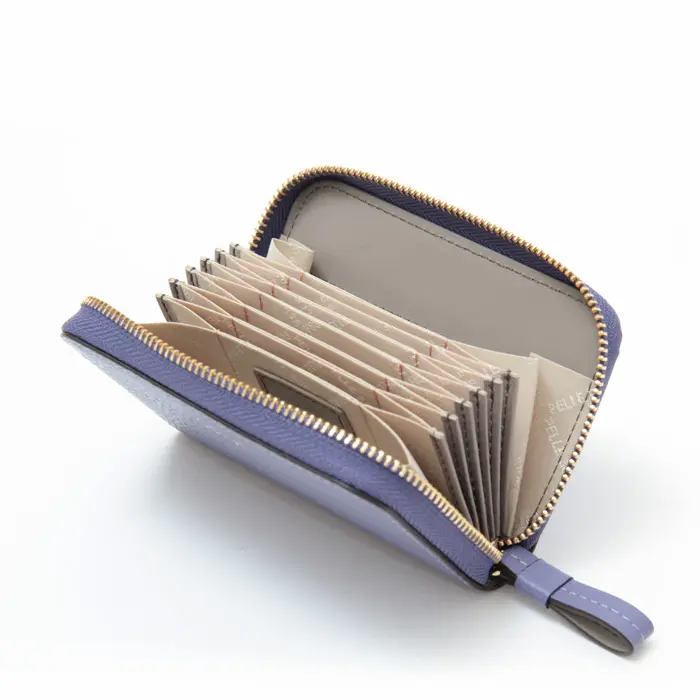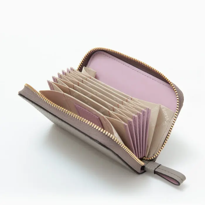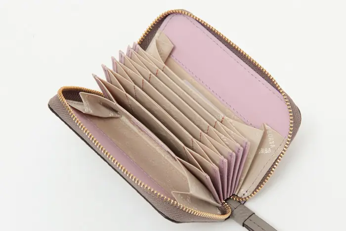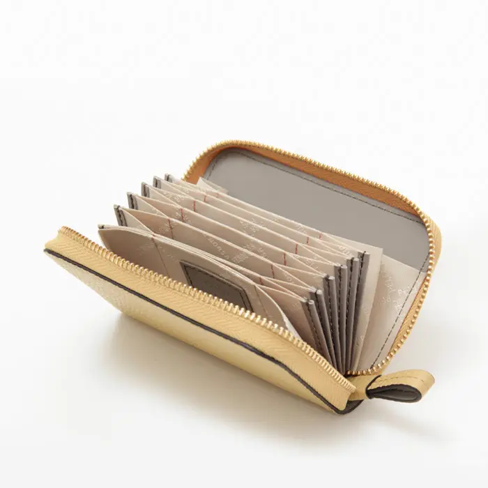 ラウンドファスナーで開閉する仕様。内側は蛇腹式で大きく開き、必要なカードや現金をスムーズに取り出せます。カードポケットは6ヶ所あり、約10枚前後のカードが収納可能です。正面・背面側にはマチ付きポケットを備え、小銭や四つ折りのお札も収まります。