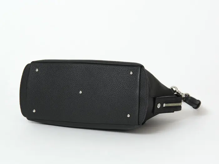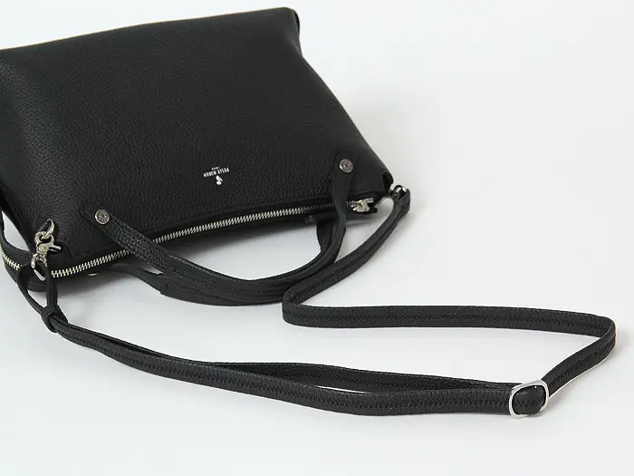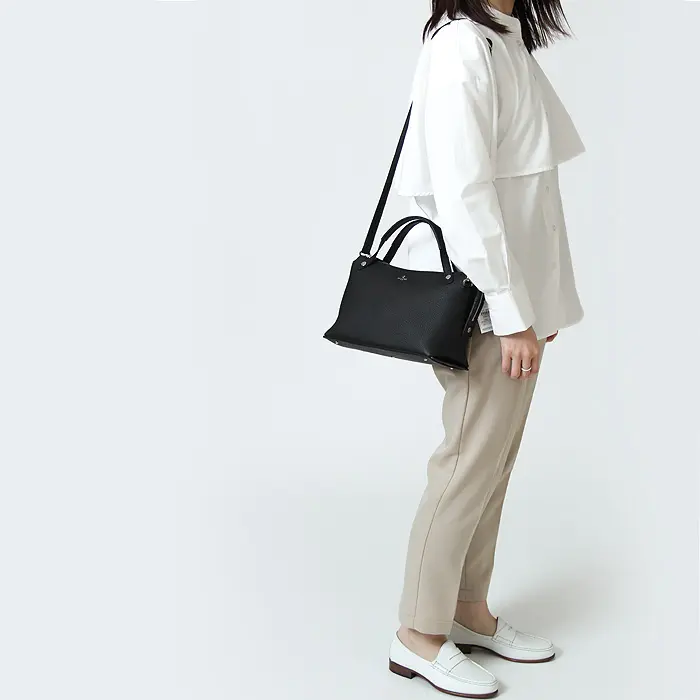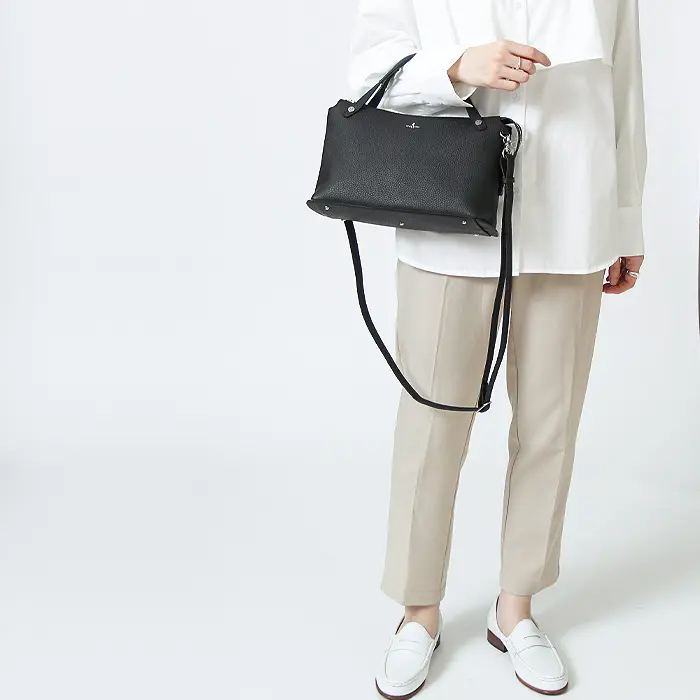 取り外しと長さ調節ができるショルダーストラップ付きの2WAY仕様。ステッチがさりげないポイントになった華奢なストラップは、やわらかな素材感で肩への負担を軽減します。斜め掛けにすれば両手が空き、上品な印象をキープできるため、通勤やお出かけにも活躍します。