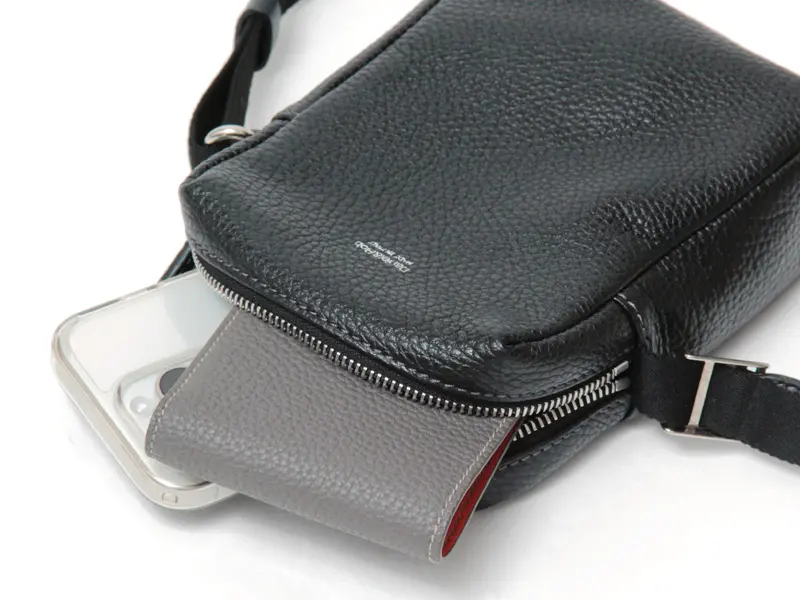 開閉はファスナー仕様で、スムーズに開閉可能。スマートフォンや折り財布、キーケースなどお出かけの必需品を持ち歩くのにちょうどいいサイズです。内側にはオープンポケットを備え、小物類も整理しやすくなっています。