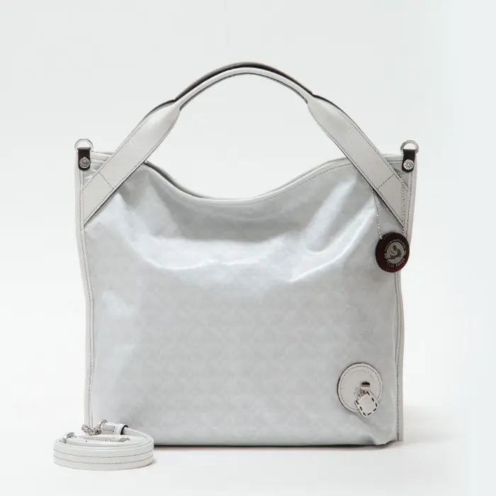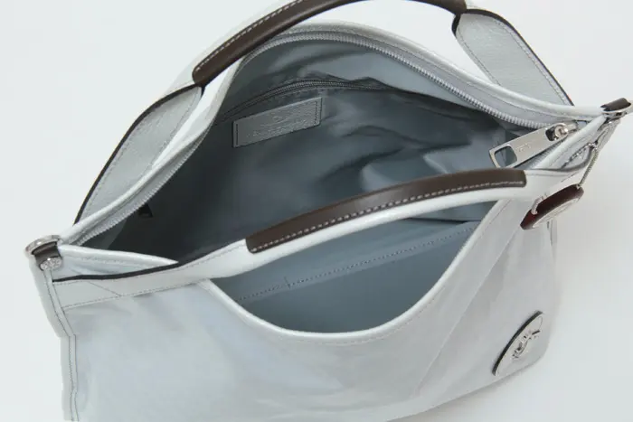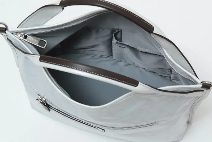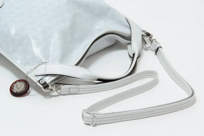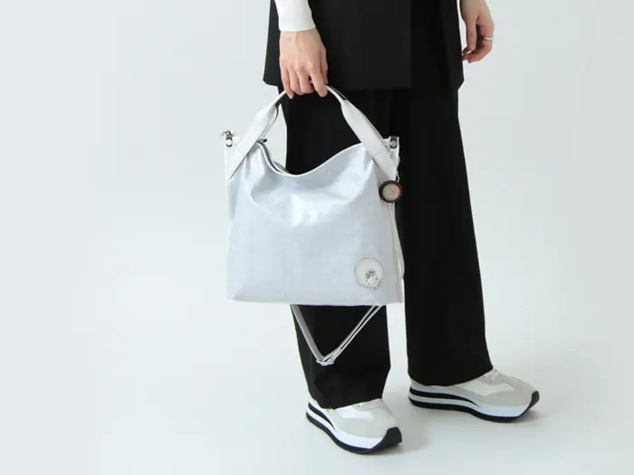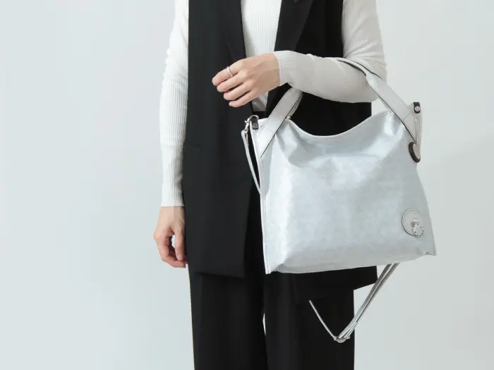 ショルダーストラップには、パール加工を施した牛革を使用。取り外しや長さ調節が可能で、斜めがけスタイルにも対応します。クロスボディで持てば両手が空き、通勤時やアクティブに動きたい日にも快適。シーンに合わせて使い分けできる、実用性の高いデザインです。