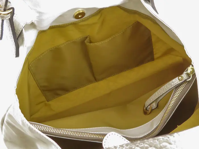 開閉はスナップボタン仕様。A4サイズがちょうど収まる実用的な大きさで、内側には中仕切りを備えています。荷物を整理しやすく、複数のポケット付きで小物の収納もスムーズ。中央のファスナーポケットにはB5サイズまで収納可能です。底面は縫い留められていないため、お弁当など厚みのある荷物も無理なく収まります。