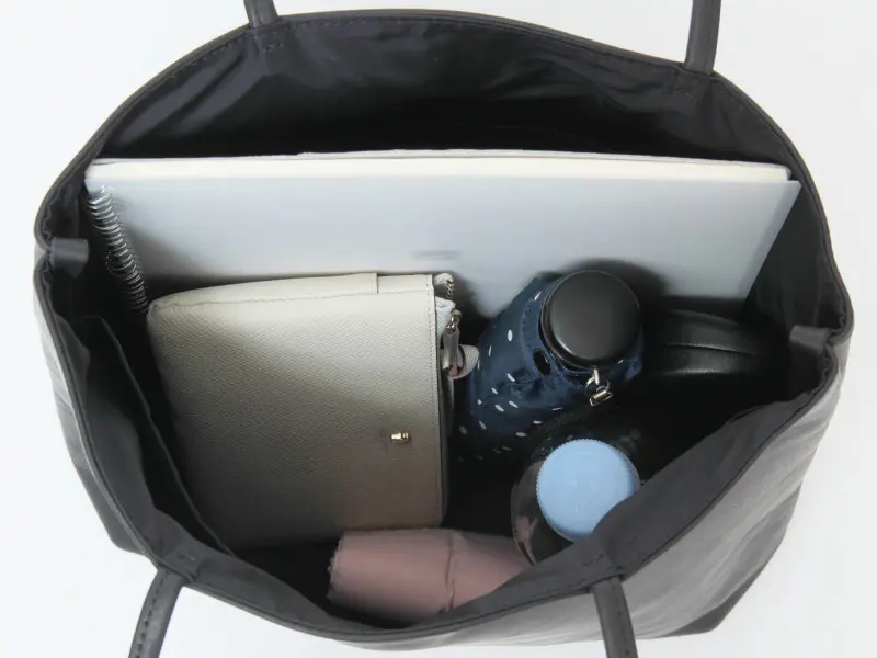 A4ノートや500mlペットボトルが収まるサイズ感で、通勤バッグとしても活躍。書類やポーチなども無理なく収納でき、必要な荷物をすっきり持ち運べます。