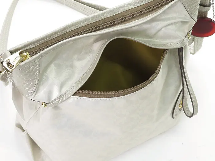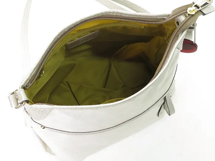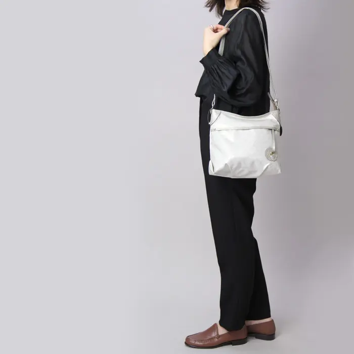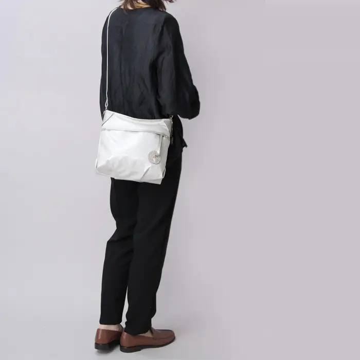 ショルダーストラップにはレザーを使用し、パール加工による上品な艶感がポイント。長さ調節ができるため、斜めがけ・肩掛けとスタイルに合わせてお使いいただけます。両手が空くので、ショッピングや旅行、キッズとのお出かけにも活躍します。