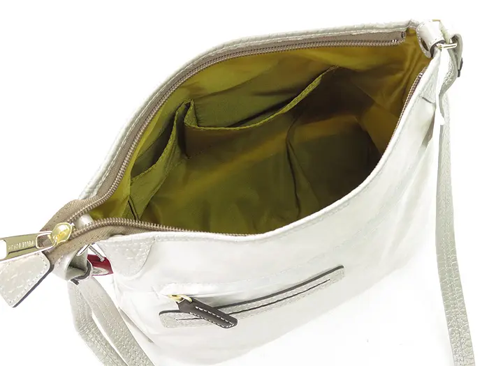 開口部は安心感のあるファスナー仕様。程よいマチ幅があり、長財布やポーチなど外出時に必要なアイテムをしっかり収納できます。内ポケット付きで、小物もすっきり整理可能です。