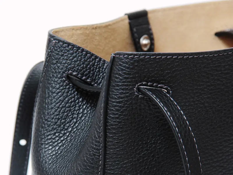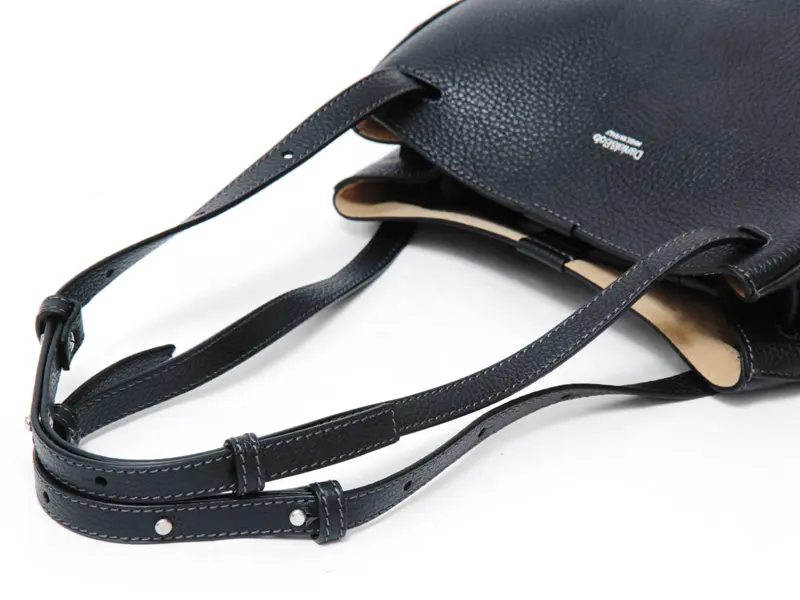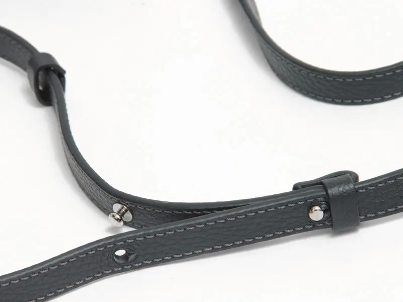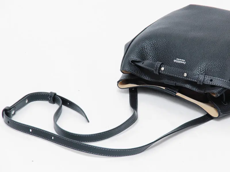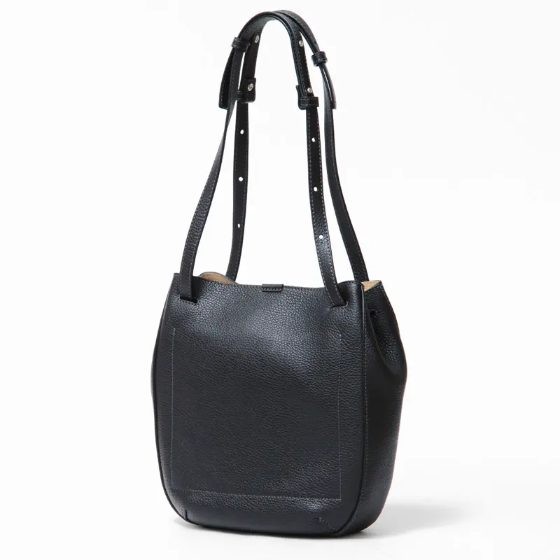 ギボシで長さを調節可能な華奢なハンドルは、全体をすっきりとしたミニマルな印象に仕上げています。一本のレザーから成り、バッグ上部でループ状に連結された構造です。