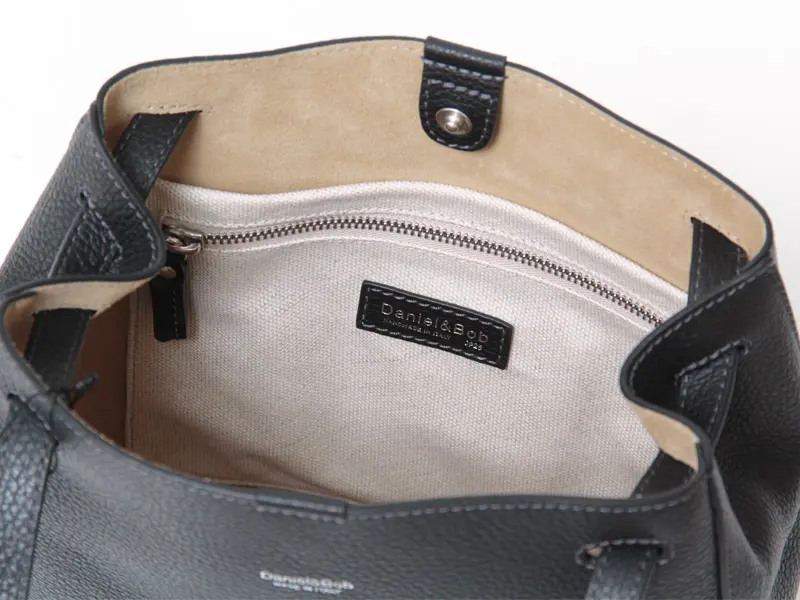 Daniel&Bobを代表するシュリンクレザー「ALCE accopiato(アルチェ アコピアート)」を使用。表面には細かなシボが美しいシュリンクレザー、内側にはスウェードを貼り合わせたダブルフェイス仕様です。柔らかさの中に程よいハリを備え、立体的なフォルムを美しくキープ。シボの陰影による豊かな表情と、内側に覗くスウェードのコントラストが、さりげない高級感を演出。比較的メンテナンスもしやすく、日常使いしやすいのも魅力です。
