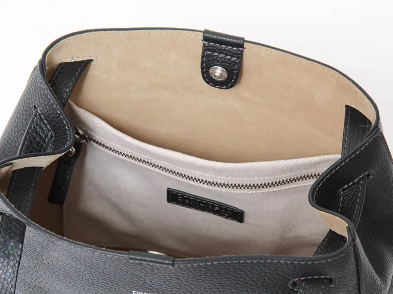 開閉はスナップボタン仕様。内ポケットにはリネン混素材を使用し、レザーとのコントラストがほどよい軽やかさを演出します。