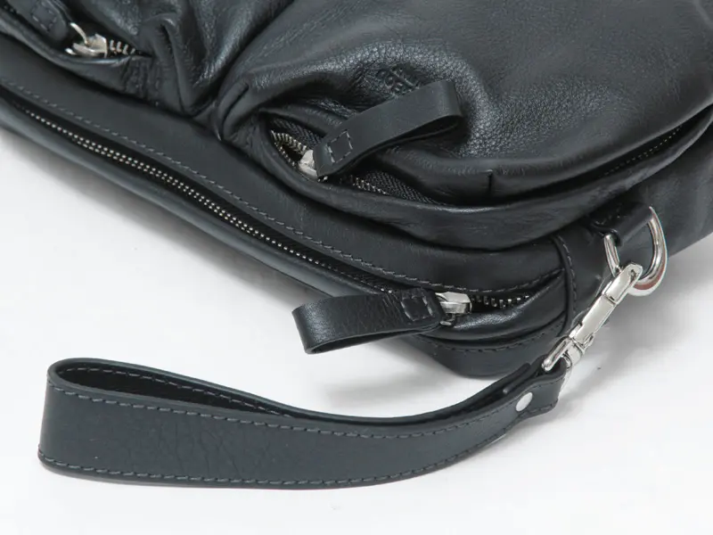 取り外し可能なストラップ付きで、クラッチとしてはもちろん、手首に掛けての使用も可能。