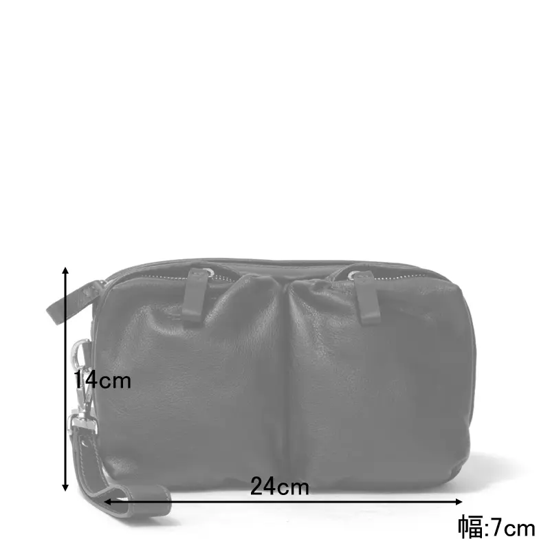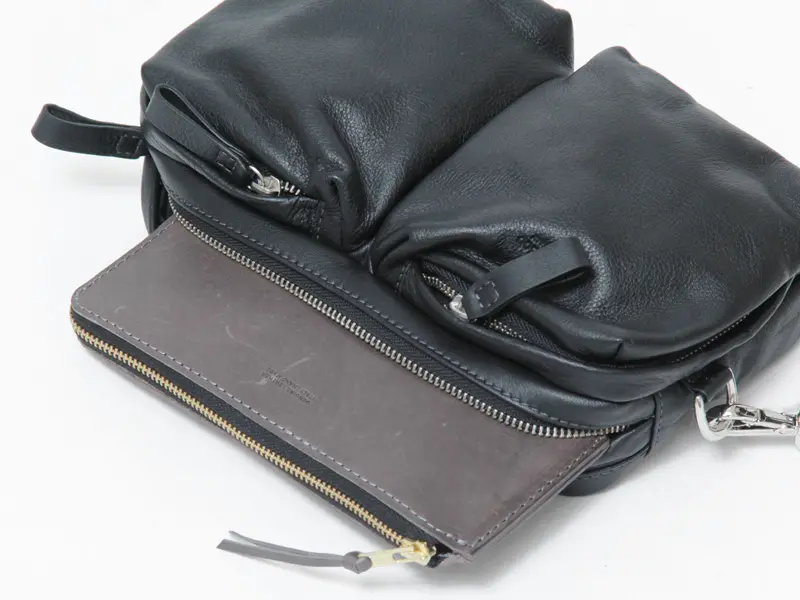 開閉はファスナー仕様で、スムーズに開閉可能。長財布がぴったり収まるサイズ感で、お出かけの必需品をコンパクトに持ち歩くのにちょうどいいサイズです。