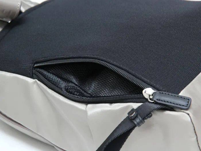 背面のファスナーはメイン収納内の背面ポケットと直結しており、荷物をサッと取り出せる使い勝手の良い設計。