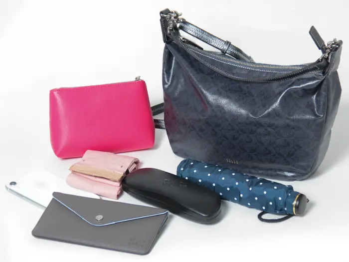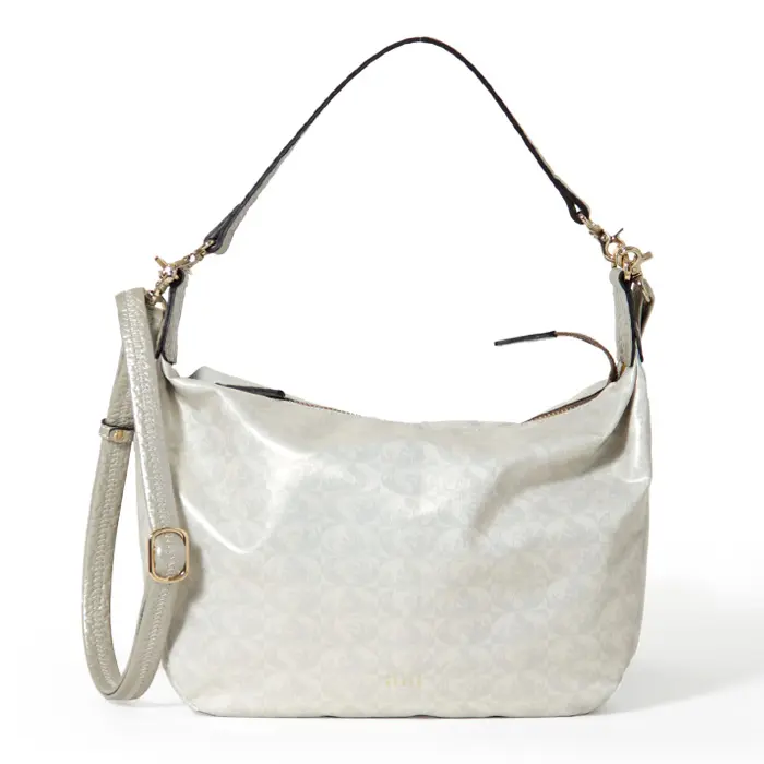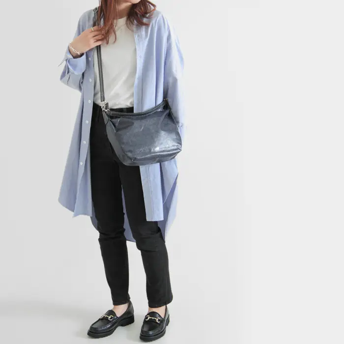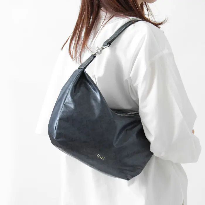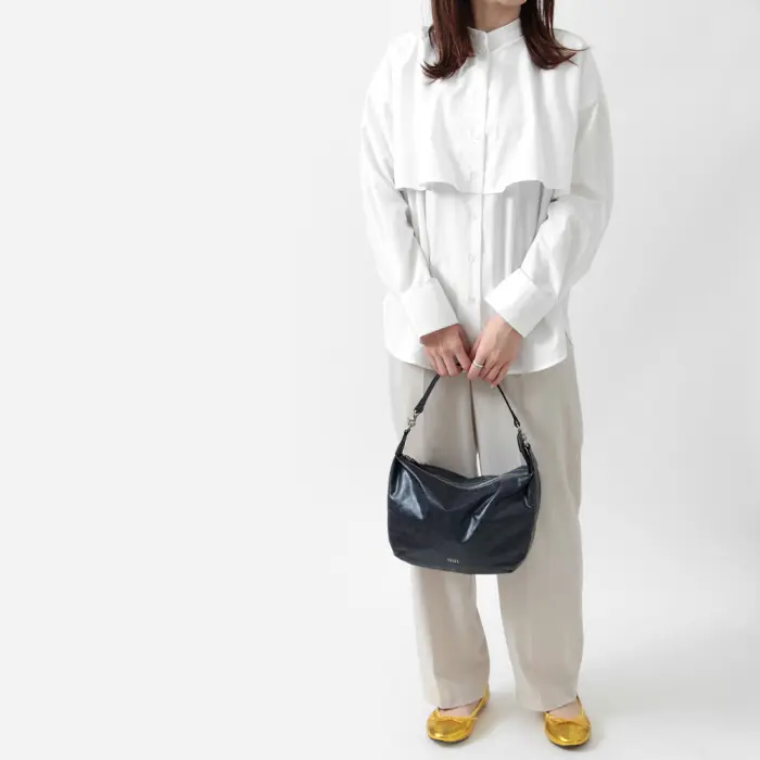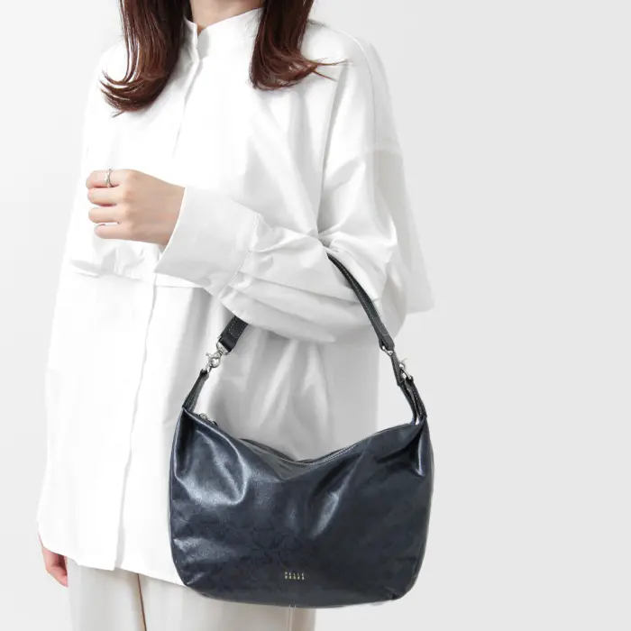 長財布を横向きに収納できる、ゆとりのあるムーン型シルエットのバッグ。ポーチや折りたたみ傘なども無理なく入る容量で、デイリー使いにちょうど良い大きさです。開閉はファスナー仕様のため中身が見えにくく、防犯面でも安心。柔らかな素材感で、荷物の出し入れもスムーズに行えます。