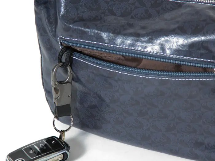 背面外側にもスマートフォンが収まるファスナーポケットを配置。ポケット内にはキーループが付いているので、鍵やパスケースを取り付けて使うことができます。