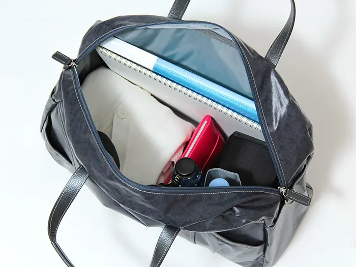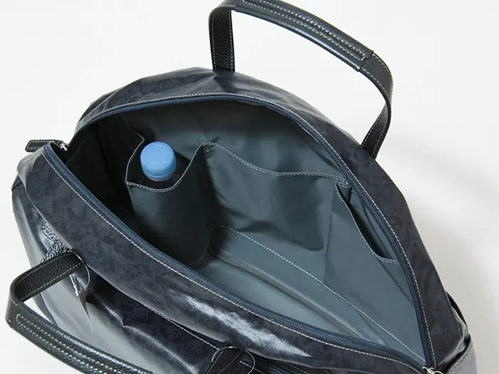 しっかりとマチ幅を確保しており、出張や1~3泊程度のご旅行にも十分対応できるサイズ感です。正面内側にはオープンポケット2つとボトルホルダー1つ、背面内側にはファスナーポケットを1つ配置。ペットボトルや折りたたみ傘を分けて収納できるのも嬉しいポイントで、細かく仕分けできるためバッグの中が散らかりにくい設計です。