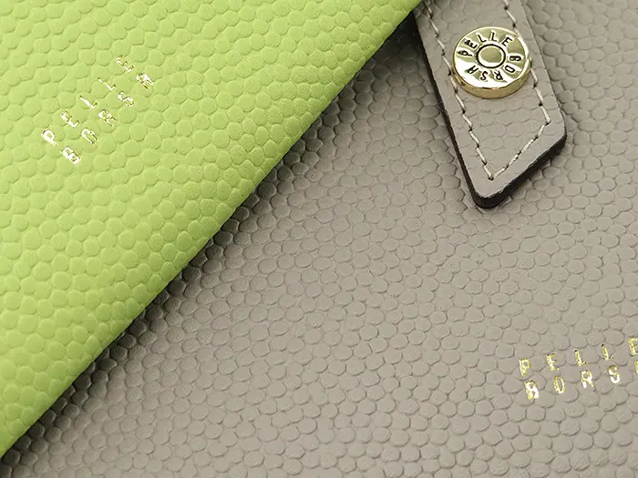 ペレボルサオリジナル「フィーネグッズ」シリーズで使用するキャビアシボレザーは、バスケットボールの型押しを応用した小粒の型押し加工が特徴です。つぶつぶとした革の表情がユニークで、他にはない個性を演出。バイカラーのスタイリッシュなデザインがさらに魅力を引き立てます。