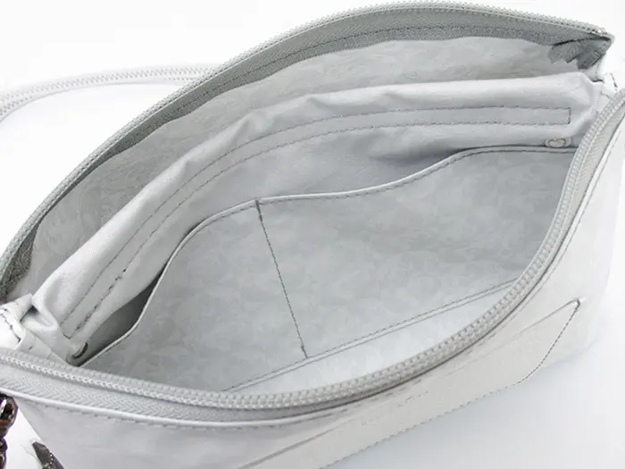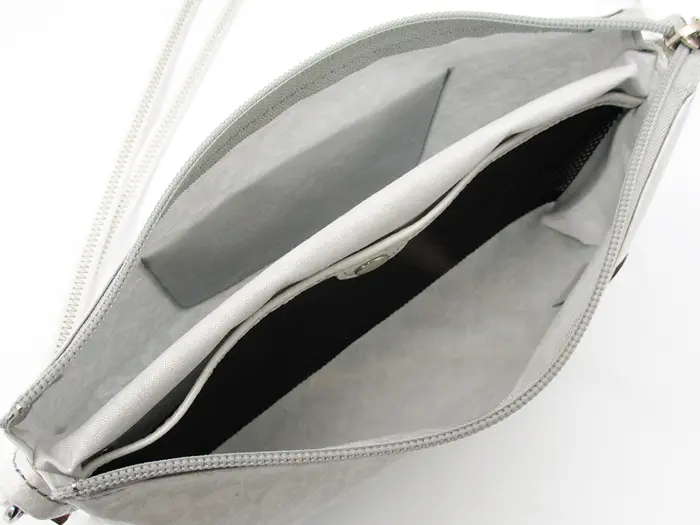 開閉はファスナー仕様。コンパクトながら収納スペースが2つに分かれ、ポケットも備えているため、バッグの中をすっきり整理できます。超軽量素材を使用しており、メインバッグとの2個持ちにも便利。必要最低限の荷物を持ち歩くのにちょうど良いサイズ感です。