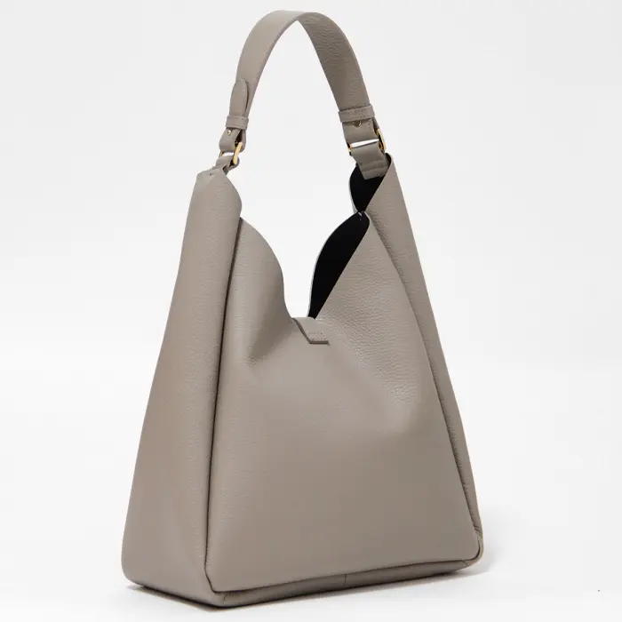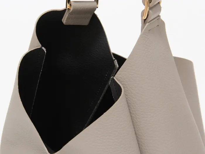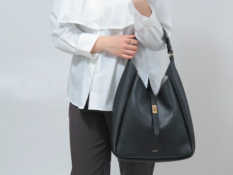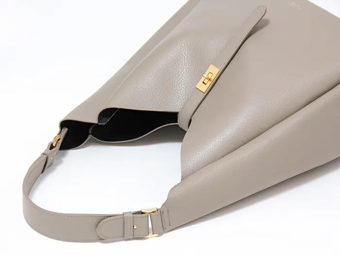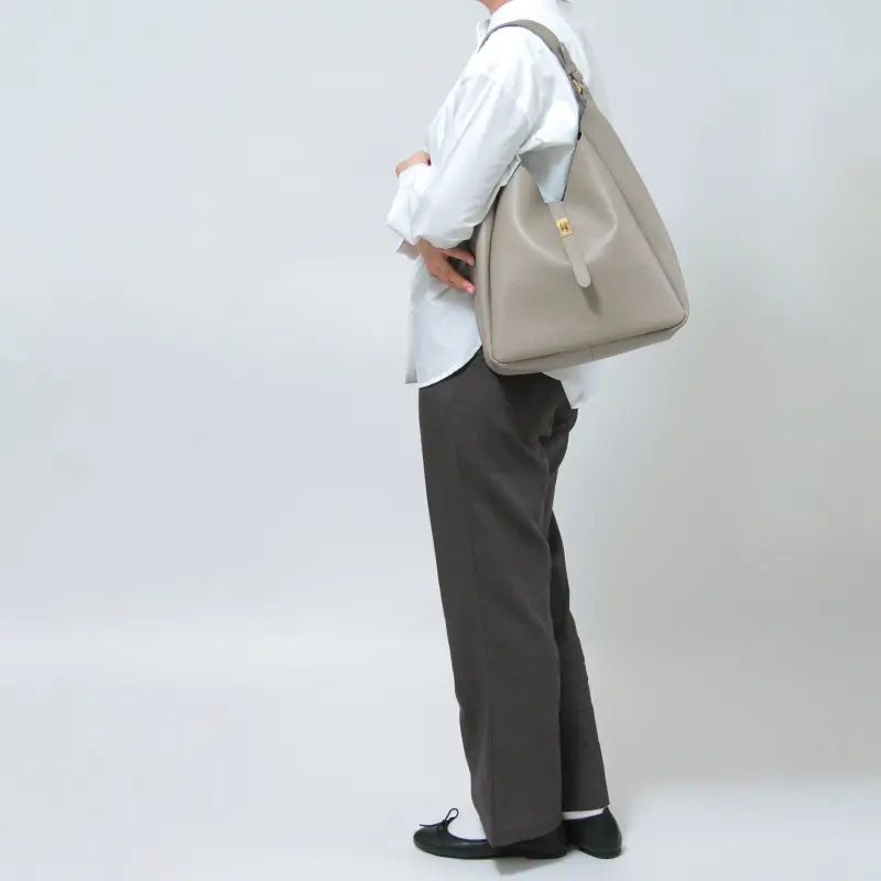 バッグ上部は山型にカッティングされており、ハンドルと本体の間に自然なゆとりを確保。厚手のアウターの上からでも肩に掛けやすく、ストレスのない持ち心地を叶えます。ゆったりとしたワンショルダー仕様で、通勤からお出かけまで快適に使えるデザインです。
