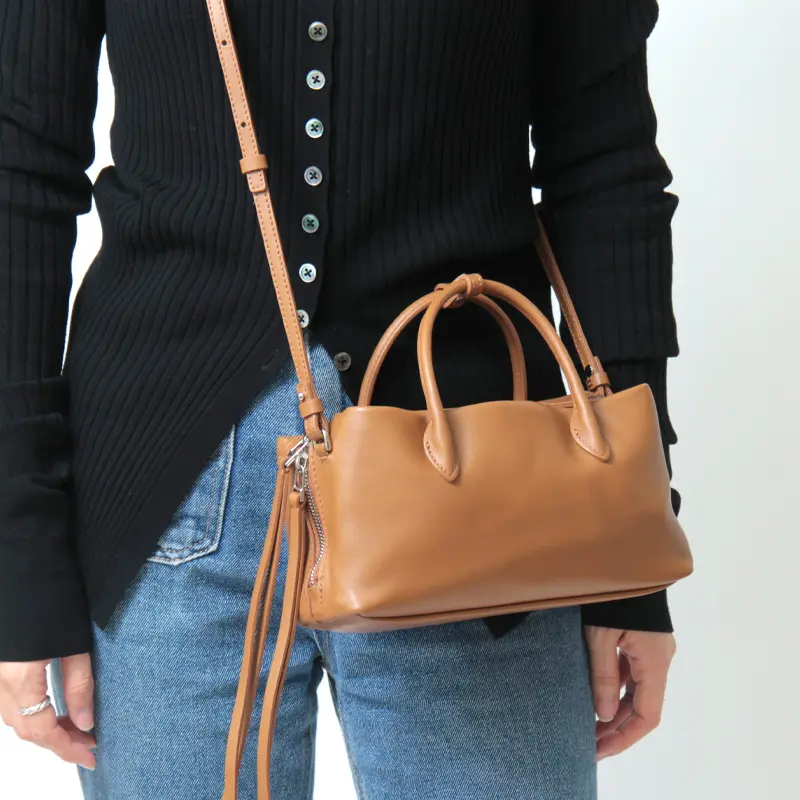 程よいハリとコシのある柔らかなイタリア製のソフト牛革を使用。フォーマルでもカジュアルでも使えるシンプルな本革のバッグは1つは持っておきたいアイテムです。 時間の経過と共に表情が変わってゆく経年変化も楽しめます。