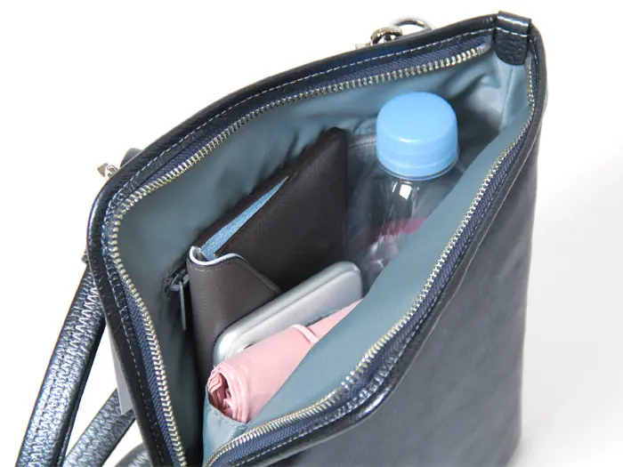 500mlのペットボトルが縦向きにすっきり収まり、長財布やメガネケースなども無理なく収納可能。見た目はスマートでも、頼れる収納力が魅力です。通勤スタイルにもなじむ、シンプルでエレガントなデザインに仕上がっています。