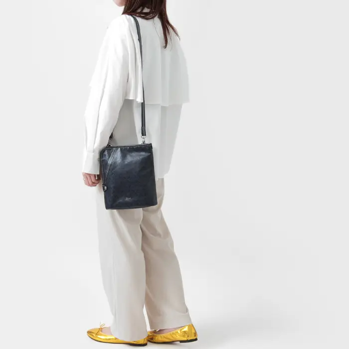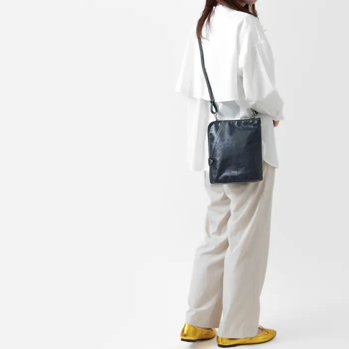 ショルダーストラップは長さ調節が可能で、斜めがけ・肩がけのどちらにも対応します。上品な細身デザインながら、袋仕立てにすることで柔らかく、華奢でも肩に負担がかかりにくい仕様。両手が空くため、デイリーからアクティブなシーンまで快適にお使いいただけます。