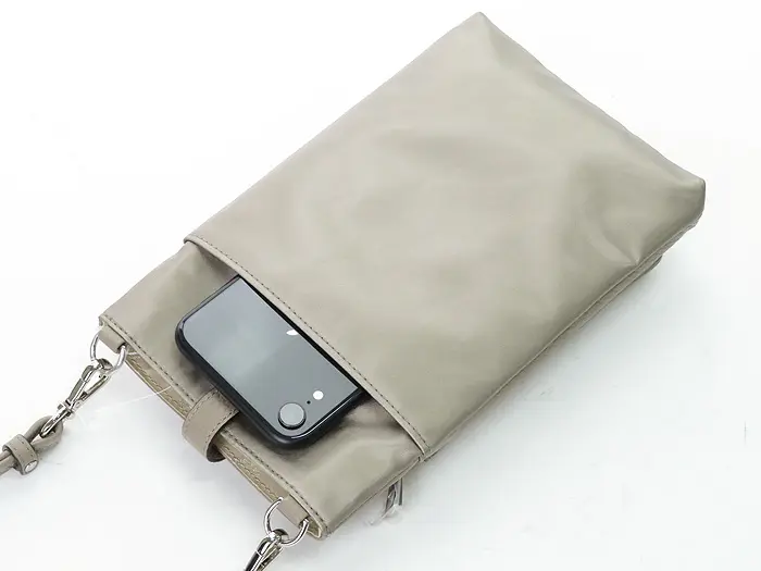 ラウンドファスナータイプの長財布も無理なく収まるよう、サイズバランスにこだわって設計されています。バッグに合わせて財布を替える必要がなく、長財布をそのまま持ち歩きたい方にも安心の容量です。また、開閉しやすさを考え、ホックは背面側に配置。手元の動きを妨げず、スムーズに開閉できる仕様に仕上げています。