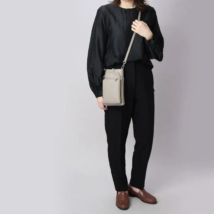 ストラップはやや短めに設計されており、前掛けの斜めがけスタイルが楽しめるショルダーバッグ。フラップ開閉のため片手でさっと開けられ、荷物の出し入れもスムーズです。お会計時や改札シーンでもストレスなく使えます。