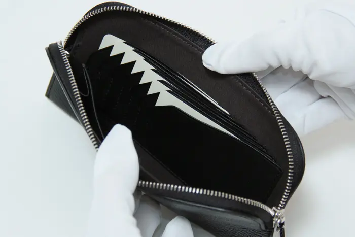 背面内側にカード収納が7ヶ所。カード入れのレザーは柔らかく、角を省くことで取り出しやすいよう工夫されています。