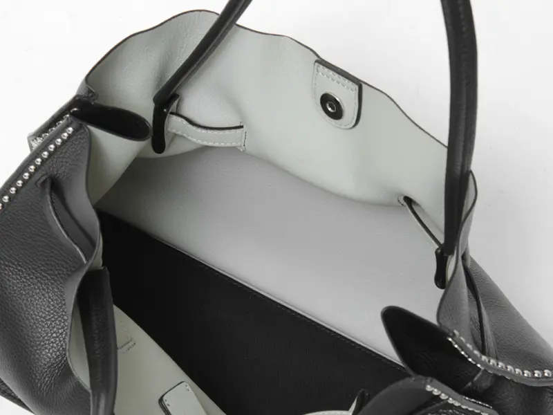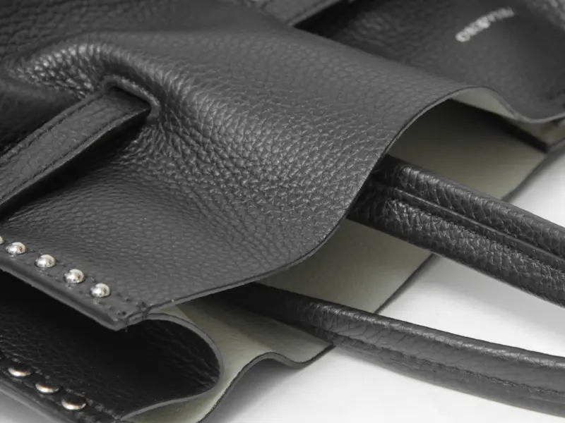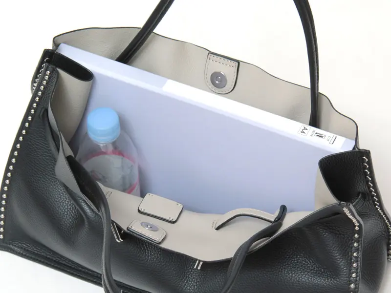 一つひとつ丁寧に打ち込まれたスタッズが、横顔に高級感をプラス。 素材は傷が目立ちにくいシボ型押しのイタリアンレザーを使用しました。 裏地のない軽やかな仕立てながら、内側にカラーを施すことで遊び心を演出。 本革の重厚感と驚きの軽さを両立した、大人のためのワークトートです。