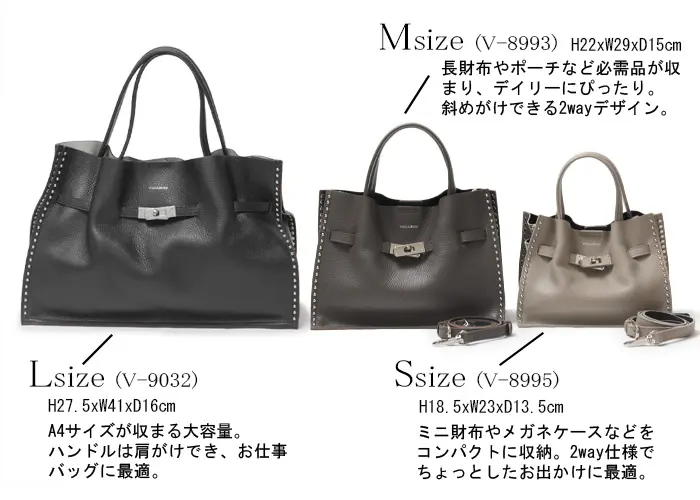 柔らかなイタリアンレザーに、小粒のスタッズが上品に輝くVIOLAd'OROの「MIRO」シリーズ。 A4書類やPCがスマートに収まるLサイズは、働く毎日に頼もしい存在です。 肩掛けしやすい長めのハンドル設計で、荷物が多い日も軽やかな足取りに。 オンタイムにモードな輝きを添える、大人のための逸品です。