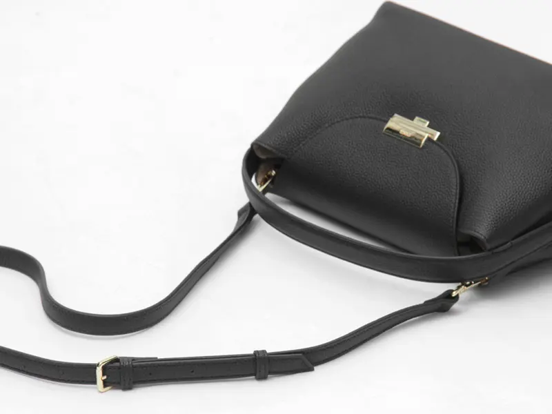 手提げとショルダーの2WAY仕様で、シーンに応じた持ち方が可能。高級感のある牛革ショルダーは、平手デザインで肩にやさしくフィットし、快適な掛け心地を実現します。ストラップ金具は内側に配置され、バッグのシルエットを損なわないミニマルな設計に。細部まで洗練された仕上がりが魅力です。