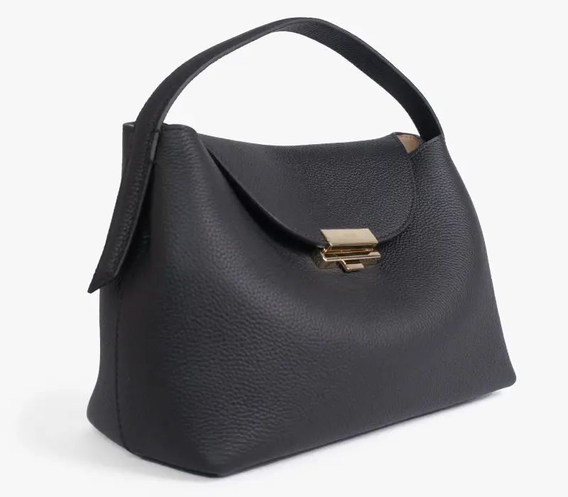 本体にはシュリンク加工を施した牛革を使用。自然なシボが傷や汚れを目立ちにくくし、柔らかくしなやかな手触りが特徴です。高級感ある豊かな表情と適度なハリで、型崩れしにくく長く愛用いただけます。使うほどに味わいを増す革の経年変化をお楽しみください。さらに、ステッチやミニマルで美しいオリジナル金具がモダンなエッセンスをプラスし、ブランドの象徴として存在感を放ちます。