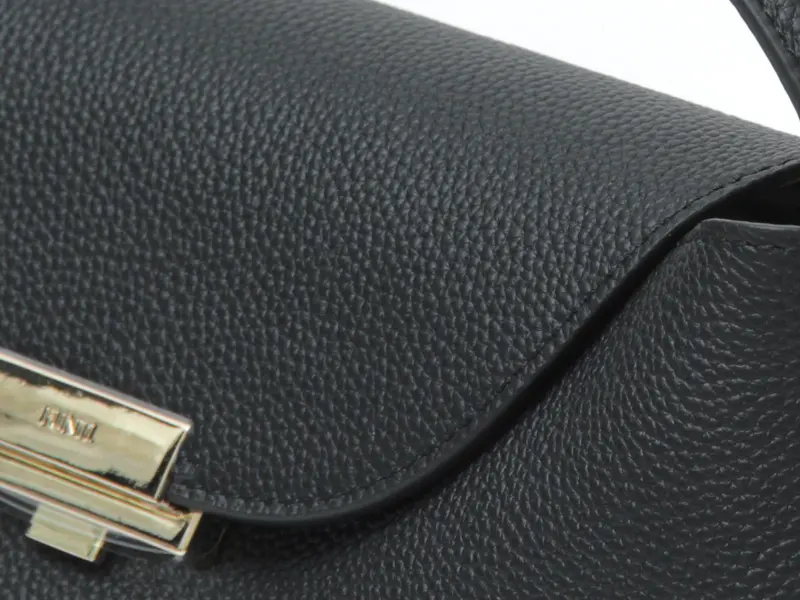 開閉はゴールドメッキのロック金具を採用し、エレガントな印象に。出っ張り部分を上に押すとロックが開き、スマートなフラップ仕様で使いやすさも兼ね備えています。
