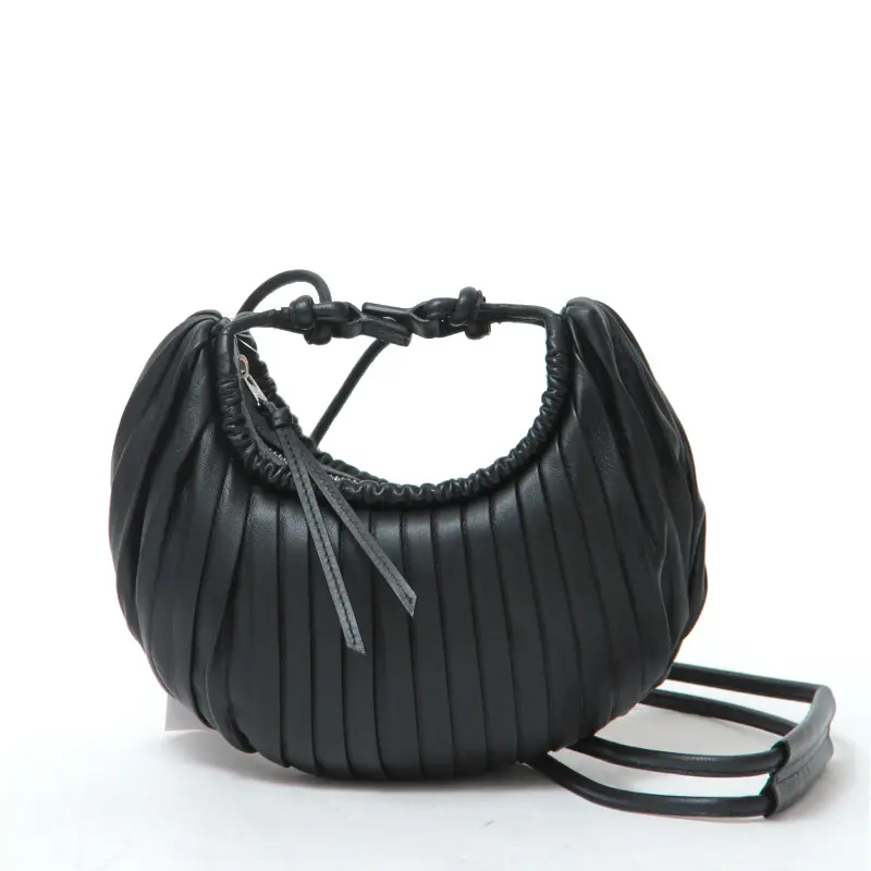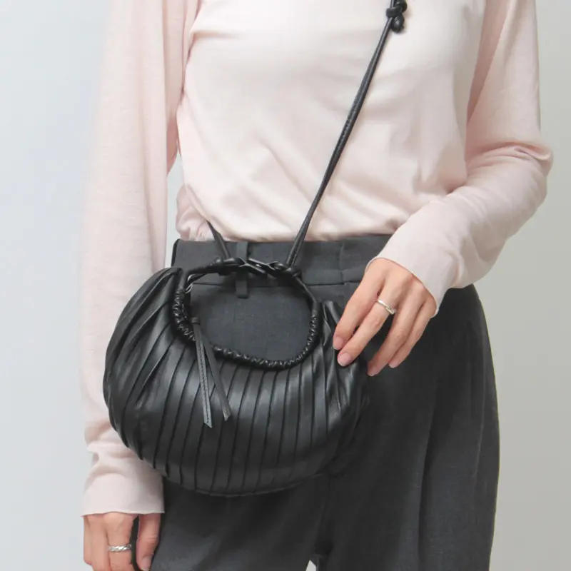 韓国・ソウル発のブランド「BOGKI(ボクギ)」RIPPLEシリーズのミニクロスボディバッグ。柔らかく軽いシープスキンを使用し、表面に施されたプリーツ加工が使うほどに自然で上品な表情に変化します。本体の機械的なプリーツと上部の不規則なシャーリングの組み合わせが、RIPPLEバッグならではの特徴です。アクセサリー感覚でコーディネートのアクセントになり、必要最小限の荷物が収まるミニバッグはデイリーにもお出かけにも最適です。